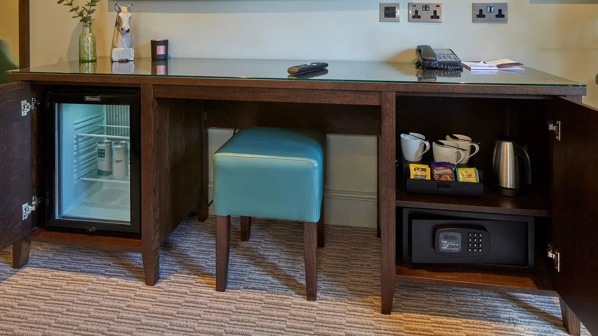Includes Premium Wi-Fi, complimentary cans of water, a fine selection of tea and coffee with a selection of alternative milks, bedside USB ports, iron, safe and hairdryer.